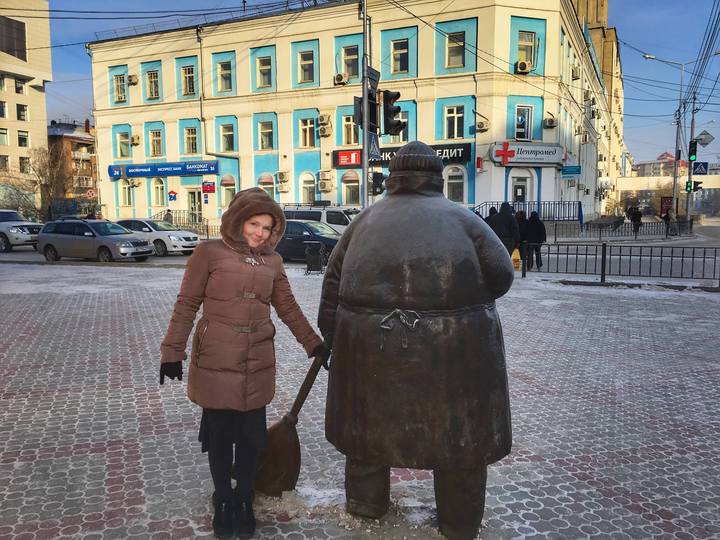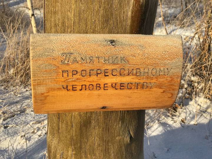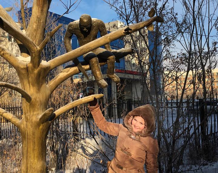 В Якутске даже установлен памятник этому первому, достойному журнала Tatler, межэтническому браку. Он же памятник! Что касается памятников, в Якутске столько интересных, что я только и делала, что перебегала от одного к другому, невзирая на ноябрьский 32-градусный мороз. Есть памятник «Прогрессивному человечеству»
