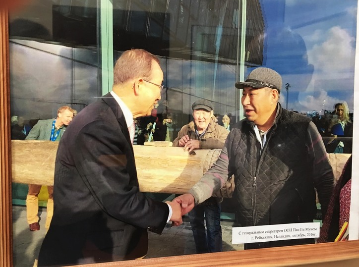 Один раз он вот так трудился в Исландии над очередным сэрге, как вдруг к нему подошёл пожать руку сам Пан Ги Мун. А в другой раз вот так же - Арнольд Шварценеггер.