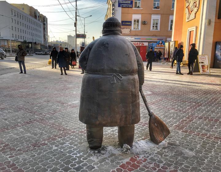 Лично мне больше всего понравился памятник дворнику, который всегда стоит к вам задом – с какого боку ни подойди. Если б якутяне побывали об эту пору в Пскове, они бы потом обязательно позаботились, чтобы у этого памятника якутскому дворнику всегда лежали живые цветы. Потому что Якутск - на диво чистый и ухоженный город.