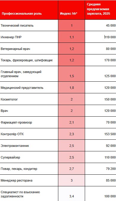 Далее в списке профессий, которых существенно не хватает местным работодателям: инженеры ПНР (1,1 резюме на вакансию), ветеринарные врачи, токари, фрезеровщики, шлифовщики (по 1,2), главные врачи и заведующие отделением (1,5), медицинские представители (1,8), косметологи, врачи (по 2,0), фармацевты-провизоры (2,1), контролеры ОТК (2,3), электромонтажники, супервайзеры (по 2,5), повара, пекари, кондитеры (2,7), менеджеры ресторана (3,0) и специалисты по взысканию задолженности (3,4).