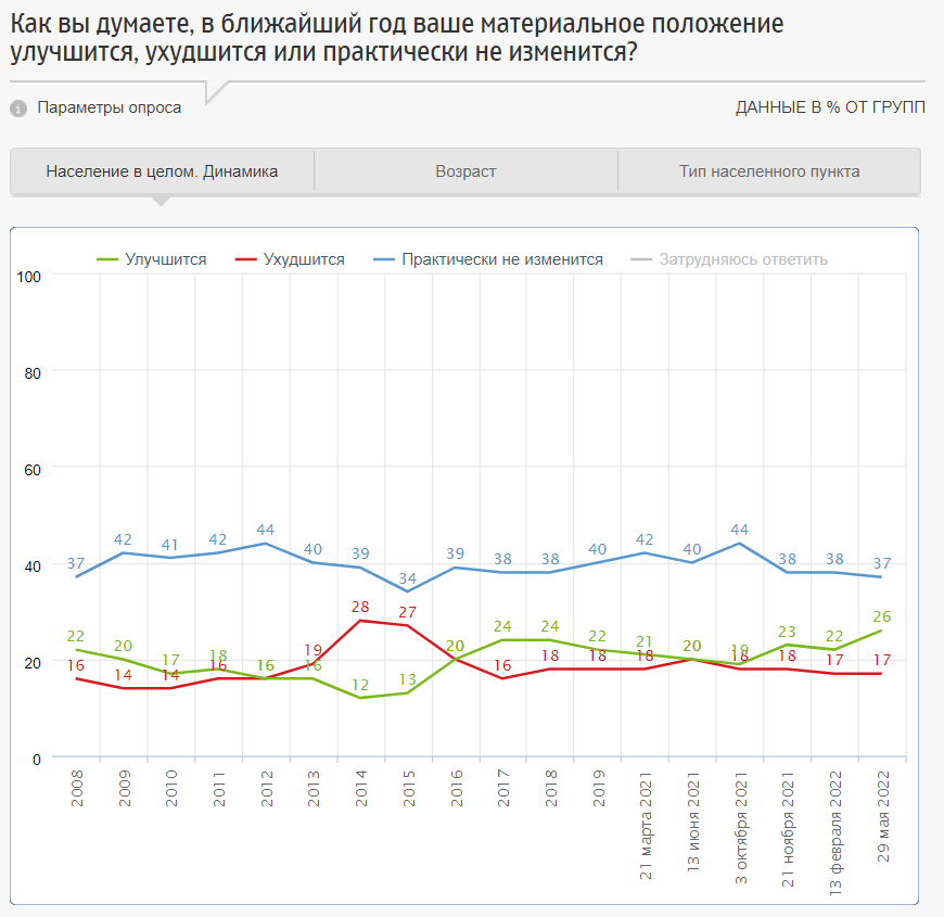 Улучшение своего материального положения в ближайший год прогнозируют 26% участников опроса, среди них 42% люди молодого возраста, ухудшение — 17%. Не ждут изменений 37% россиян.