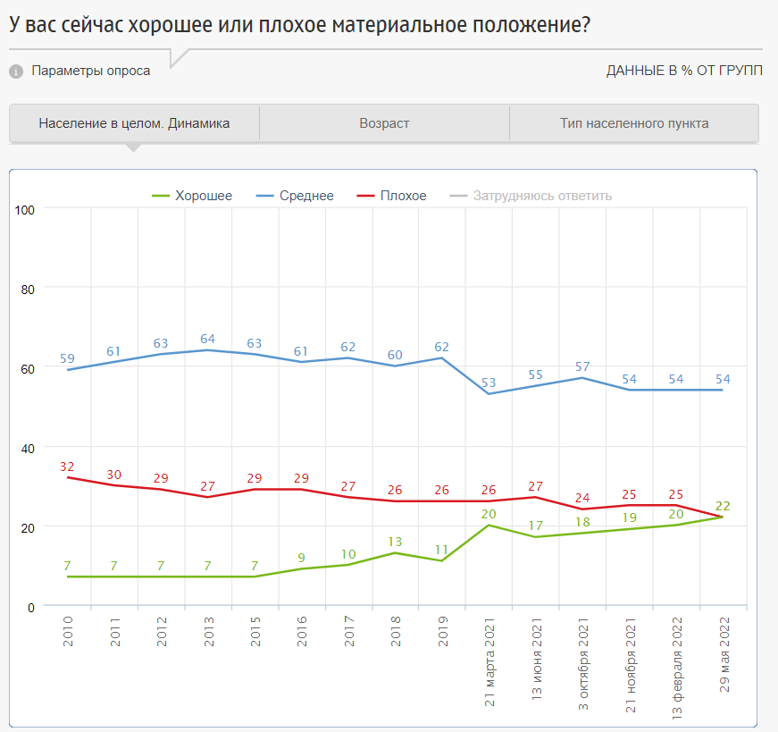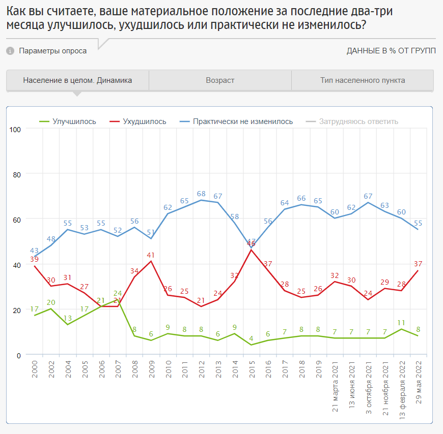 Фонд «Общественное мнение» провел опрос и выяснил, что у 37% респондентов ухудшилось материальное положение за последние два-три месяца. Таких людей стало на 9 процентных пунктов больше, чем в середине февраля, когда ФОМ проводил предыдущий опрос.