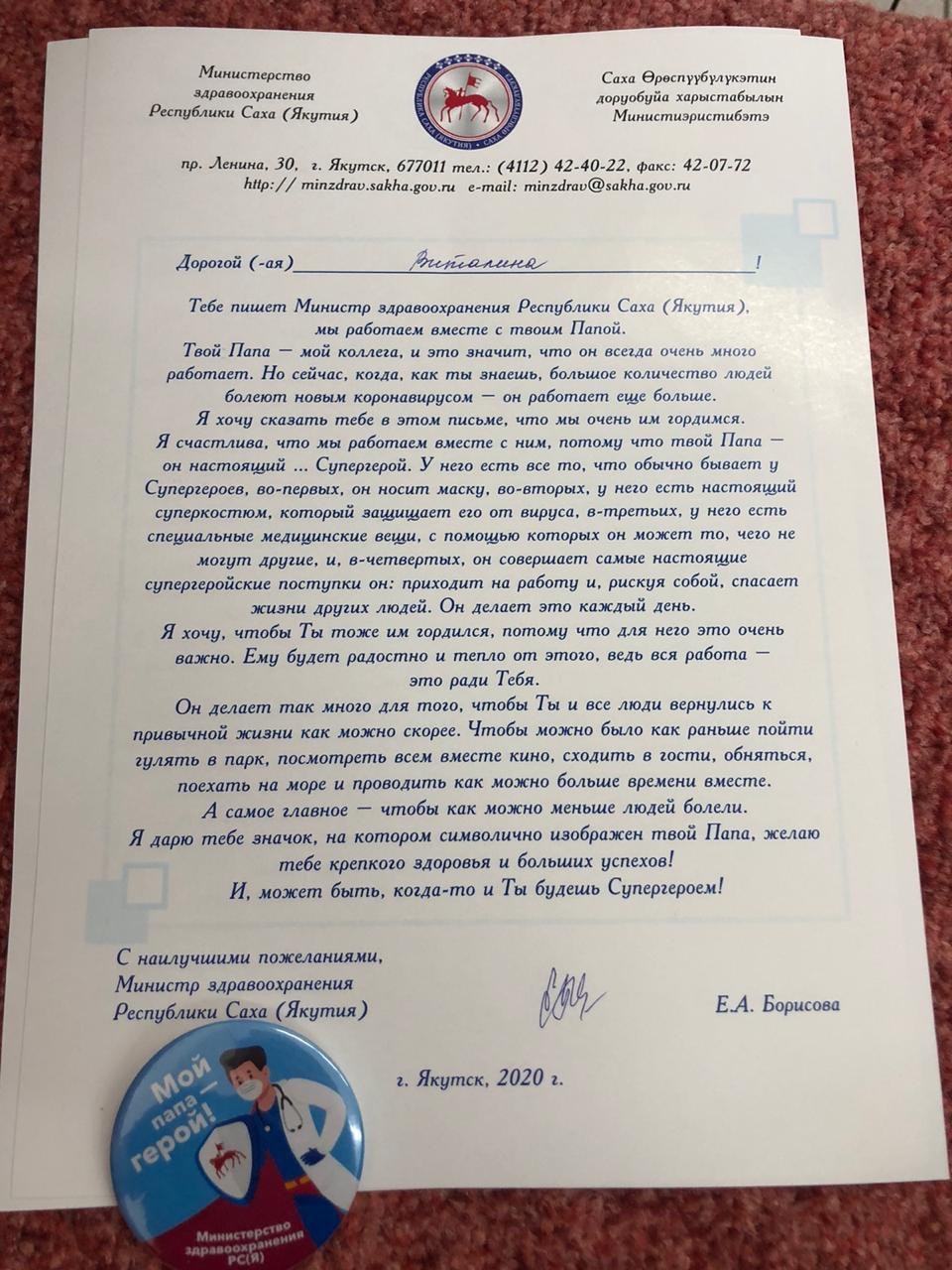 Дети медицинских работников получили письма от министра здравоохранения Якутии Елены Борисовой, сообщает Sakhaday.
