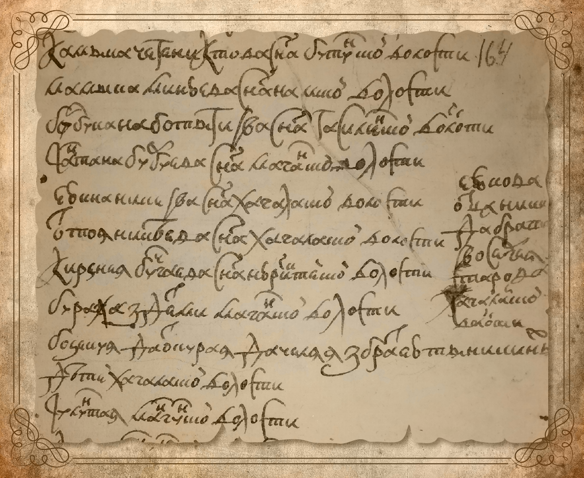 «Того ж году я, Петрушка, по государеву указу великому государю в новоприбыли учинил на Лене ж реке служилых и с промышленных людей, с судных дел собрал государевы казны мяхкие рухляд[и] <…> (Л. 164) Бозекуя да Откурая, да Челяя з братьею Тыникиных детей Хагалаской волости».