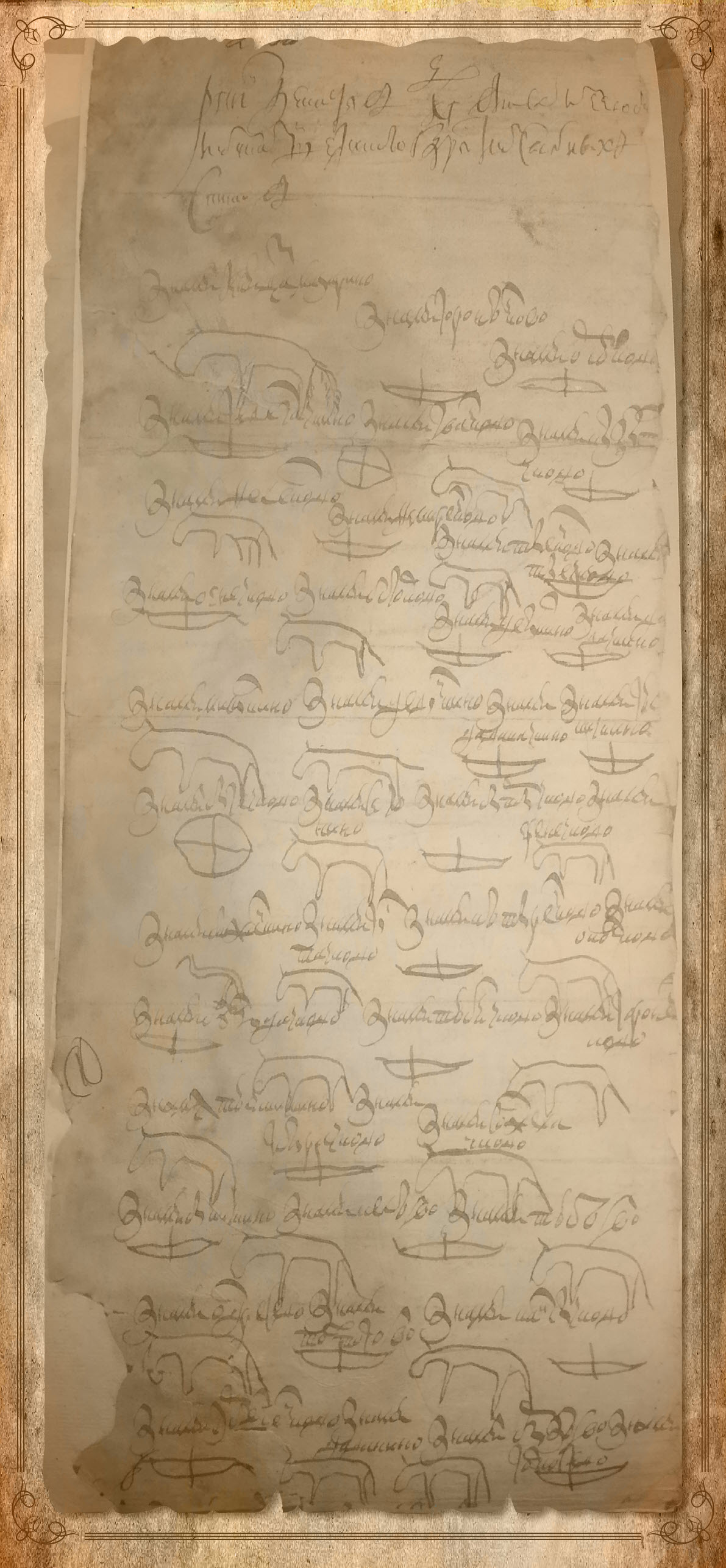 На обороте листов имеются знамена всех челобитчиков в виде лошадей, кругов с перекрестием, луков со стрелами и неких треугольников с двумя вертикальными линиями.