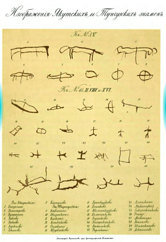 По назначению знамена якутов в XVII в. можно разделить на две группы: тамги шаманов и тамги рядовых ясачных людей. Шаманской тамгой был рисунок бубна. Графически он изображался в виде диска, перечеркнутого крест-накрест. По сюжетам большинство знаков рядовых якутов представляли собой рисунки лошадей и луков» [61].
