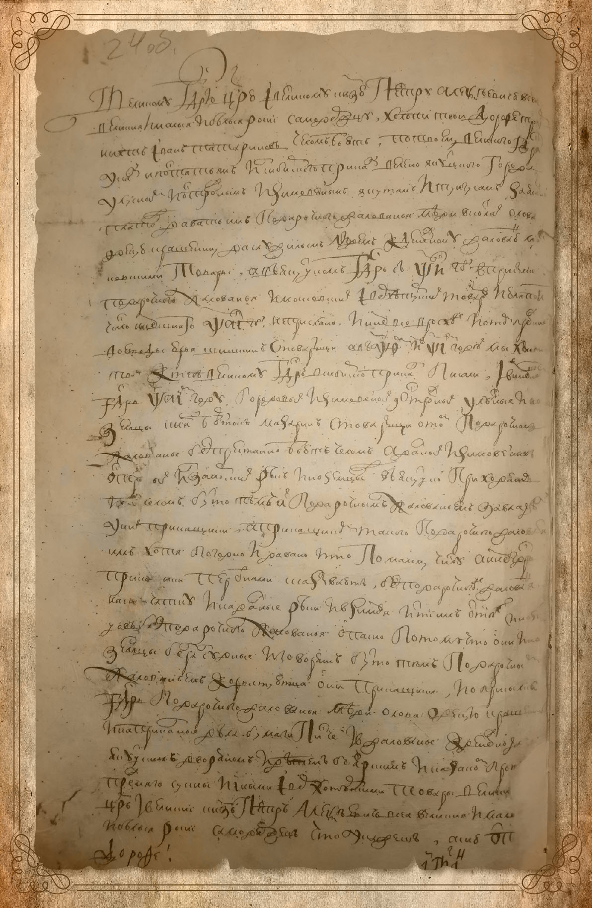 «(Л. 24 об.) Великому государю царю и великому князю Петру Алексеевичю великия и малыя и белыя Росии самодержцу холопи твои Дорофей Троурнихт, Иван Татаринов челом бьют. По твоему, великого государя указу, и по статьям из Сибирского приказу велено Якутцкого города улусным и острожным, и зимовейным якутам и тунгусам за ясачной платеж давать им подарочного жалованья: меди в котлах, олово, одекую, крашенину да служилым людем к денежному жалованью московскими товары. А в Якутцком, государь, с 708-го года в присылке подарочного жалованья и московских и верхотурских товаров июля по 8 число нынешняго 711-го году не прислано и ныне все в росходе, и о том прежние воеводы Юрья Шишкин с товарыщи, а в 709-м и в 710-м годех мы, холопи твои, к тебе, великому государю, в Сибирской приказ писали и в нынешнем, государь, 711-м году городовых и зимовейных, и острожных улусные иноземцы князь Борток Мазарин с товарыщи о том подарочном жалованье беспрестанно бьют челом, а далных и зимовейных, острожных и заморских рек иноземцы в Якутцкой приходят и [бьют челом], бутто тем их подарочным жалованьем завладели у них прикащики, а прикащиком такого подарочного жалованьи им хотя погодно и давано и то по малому числу. А ныне, государь, прикащики перед нами сказывают: бесподарочного де жалованья на [Кам]чатку и на далные реки и в зимовья идти им от тех иноземцов без подарочного жалованья опасно, потому что они, иноземцы, безразсудные и говорят, бутто тем подарочным жалованьем корыстуютца они, прикащики, и о присылке, государь, подарочного жалованья – меди, олова, одекую, крашенины и на приказные дела бумаги писчей и в жалованье к денежной да[чи] якутским дворяном и детем боярским, и казаком прот[ив] прежняго сукны и иными и верхотурскими товары велики[й] царь и великий князь Петр Алексеевич все великия и мал[ыя] и белыя Росии самодержец, что укажешь. А сию отп[иску]