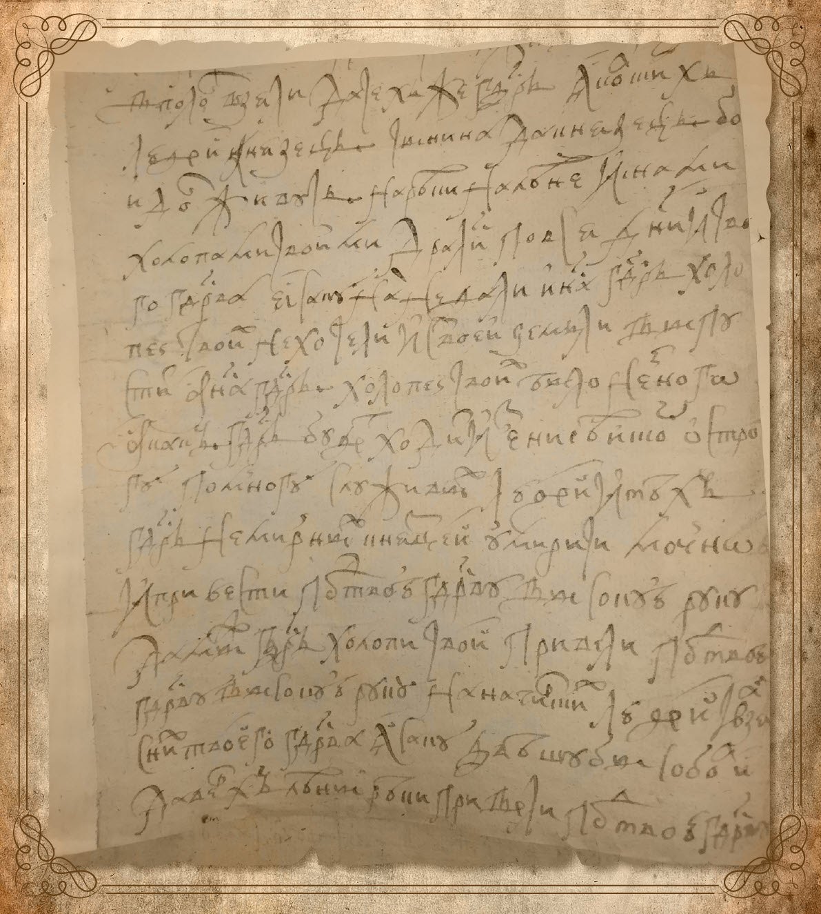 «Царю государю и великому князю Феодору Алексеевичю всеа великия и малыя и белыя [России само]держцу бьют челом холопи твои Яку[цкого] острогу кнезец Мазаречко Тыгинин да Чюгунко Бодаев. Били челом мы, холопи твои, в своих обидах и в розоренье на Сергея и на Максима Мухоплевых и подали челобитную в Сибирском приказе. И ныне мы, холопи твои, и за всех якутов Сергеем и с Максимом во всем помирились и впредь мы на них… тебе, великому государю, не челобитчики… Вели, государь, челобитье наше и мир записать и вели, государь, Сергею и Максиму в Якуцком остроге быть по-прежнему»