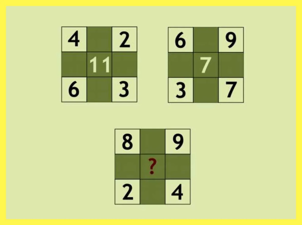 Итак, решение: к числу, которое расположено в левом нижнем квадрате, нужно прибавить число из левого верхнего квадрата, а зачем вычесть цифру из правого верхнего квадрата и прибавить к полученному оставшееся значение. Таким образом, мы имеем пример: 2+8-9+4=10-9+4=5.