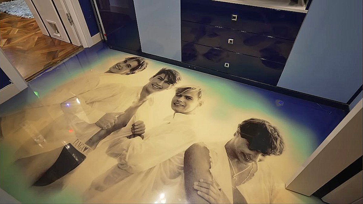 В итоге получилось кислотно-неоновое, интересное и эксцентричное жилище — под стать своему хозяину. В нём можно обнаружить практически чёрную спальню, а на кухне — фотопечать с участниками группы «На-На». Также в квартире есть маленькая баня, рассчитанная на одного человека.