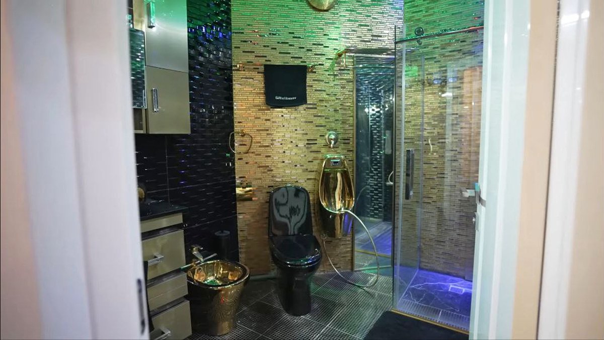 А вот ванная комната вызывает у многих вопросы: чёрный унитаз и золотой писсуар — довольно неожиданное решение, но оно полностью отражает суть творчества артиста.