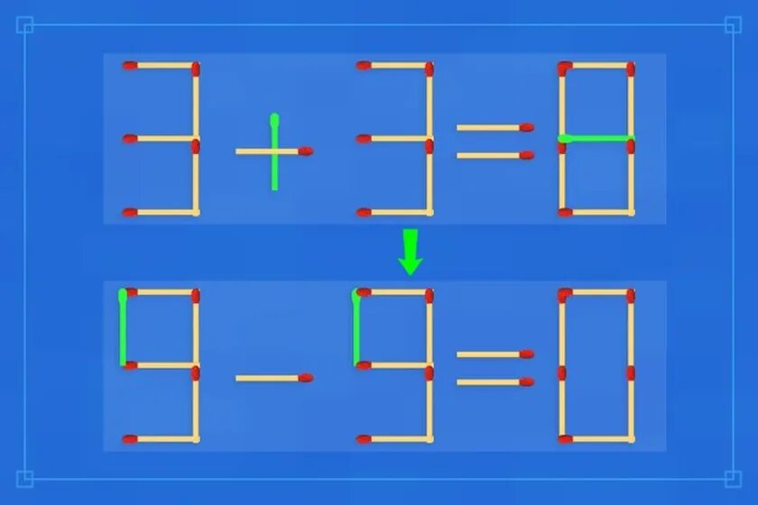 Перед вами неверное равенство. Можете разложить спички на своём столе так же как вы видите их на картинке. Для его решения вам понадобится ровно 21 спичка и немного внимания. Переместите две спички так, чтобы уравнение стало верным.