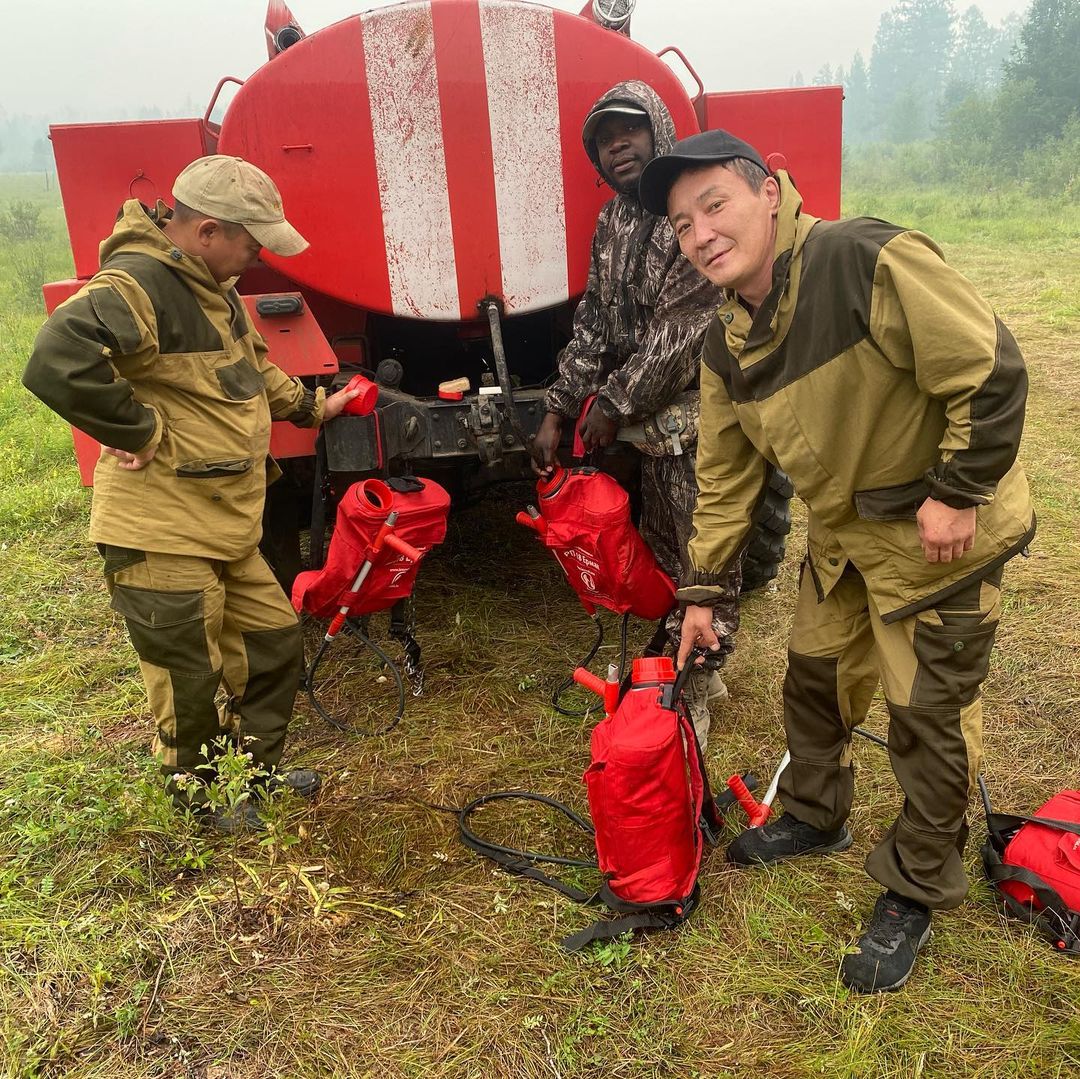 "Самый северный нигериец в мире" Марк Бабатунде не остался в стороне и вместе с добровольцами тушит пожары в Якутии. Также на фото замечен главврач Хангаласской ЦРБ Нюргун Степанов.