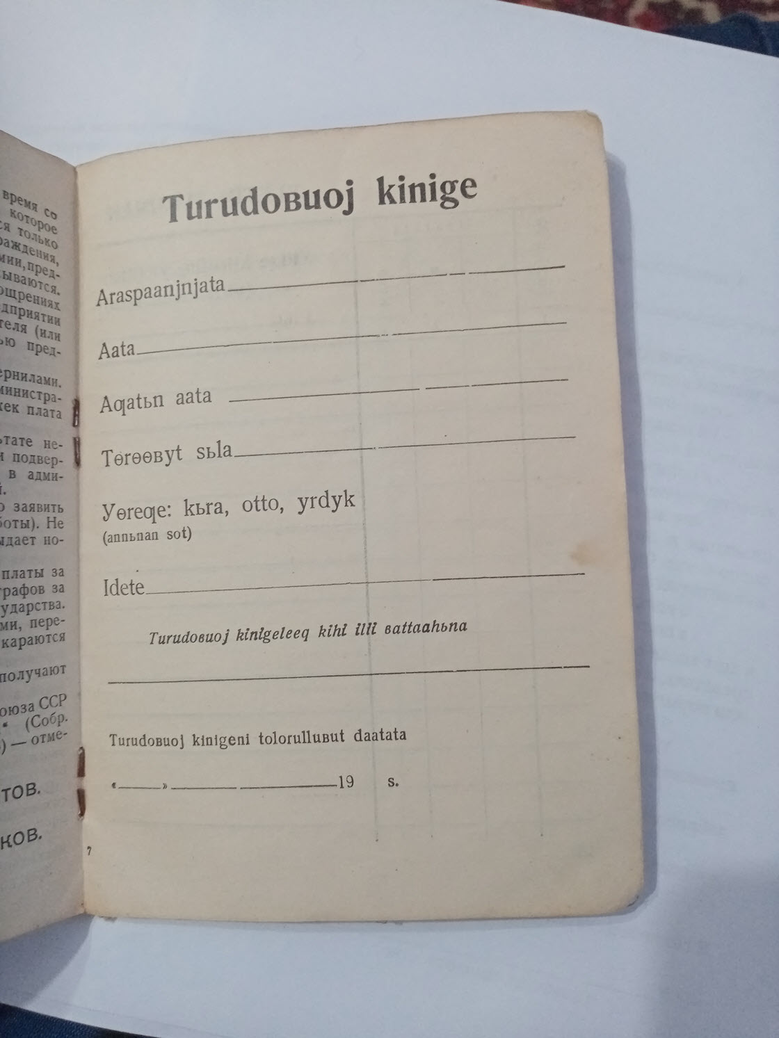Трудовая книжка. Обратите внимание надпись также выполнена латинскими буквами якутского алфавита