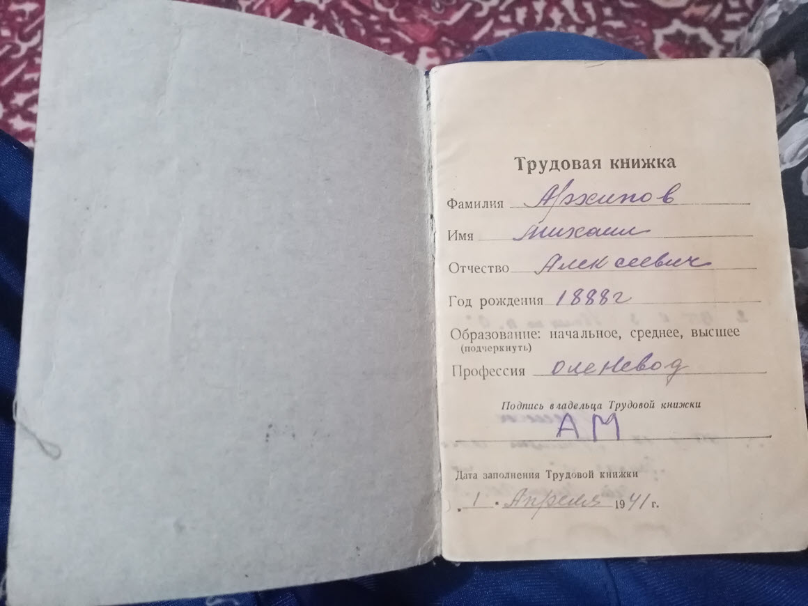 Михаил Архипов 1888 года рождения был неграмотным. Читать и писать, в основном, не умел. И только в советское время обучился кое-какой грамоте. Документы он подписывал инициалами: «АМ», то есть, Архипов Михаил.