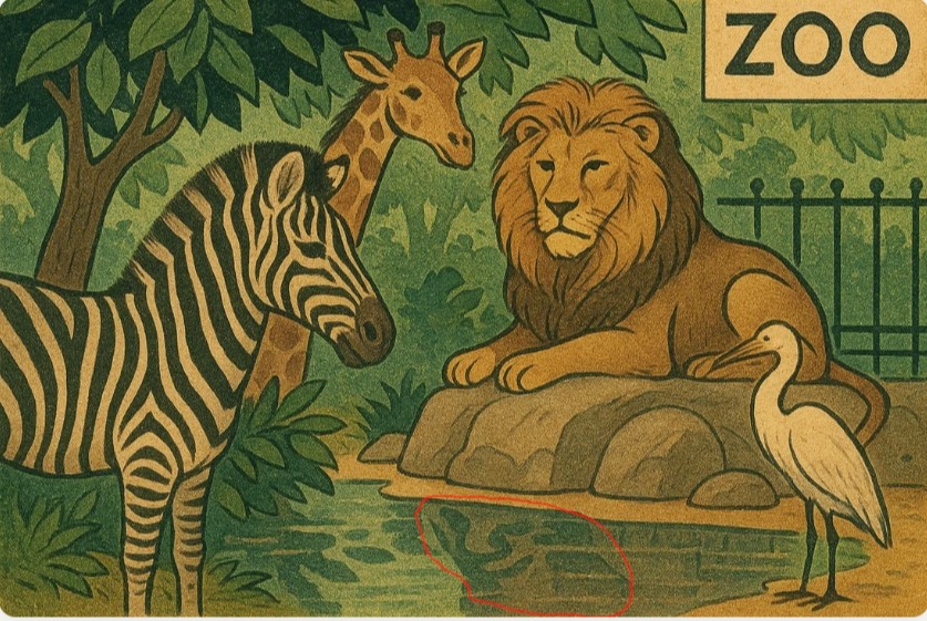 Сидели как-то в зоопарке жираф, зебра, лев и цапля да мирно отдыхали у пруда. А тут — человек! Да, не все так очевидно. На картинке скрыто еще одно изображение, которое не сразу бросается в глаза. Задача состоит в том, чтобы внимательно присмотреться и обнаружить спрятанное человеческое лицо.