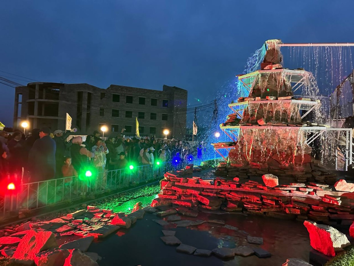 Строительство самодельного водопада началось еще в 2021 году. Работы проводили не спеша — только в летнее время. Новый объект состоит из металла и скальника. Его подсвечивают архитектурные прожекторы. Высота строения— пять метров, протяжность — около 20. Водопад расположен у здания местной администрации.