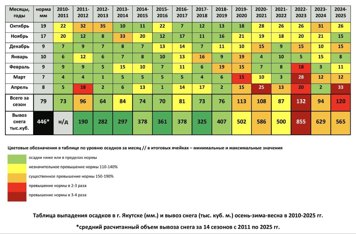 В этой таблице указаны данные об уровне осадков за последние 15 лет в зимний и весенний сезон – с 2010 по 2025 гг.