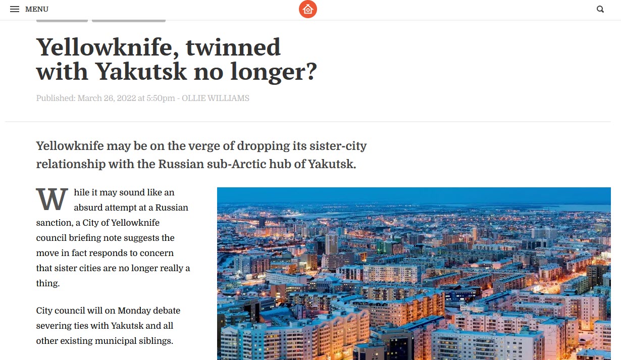 Эта мартовская новость из Канады прошла незамеченной. В мэрии города Йеллоунайф (Канада) обсуждали как в одностороннем порядке прекратить отношения с Якутском как с городом-побратимом. В итоге, к какому выводу пришли - неизвестно.