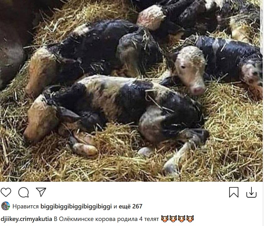 В новостных пабликах и сайтах появилась новость о корове в Олекминске, родившей четырех телят. В подтверждение рассылалась фотография коровы с новорожденными. В соцсетях мгновенно стали обсуждать, возможно ли такое.
