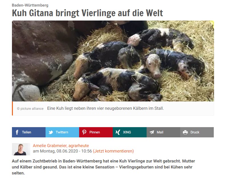 SakhaDay выяснил, что в якутских пабликах была опубликована фотография коровы из Германии, у которой в прошлом году произошли четвертные роды. Это была сенсационная новость, так как подобные роды очень редки. О корове Гитане писали в немецкой прессе.