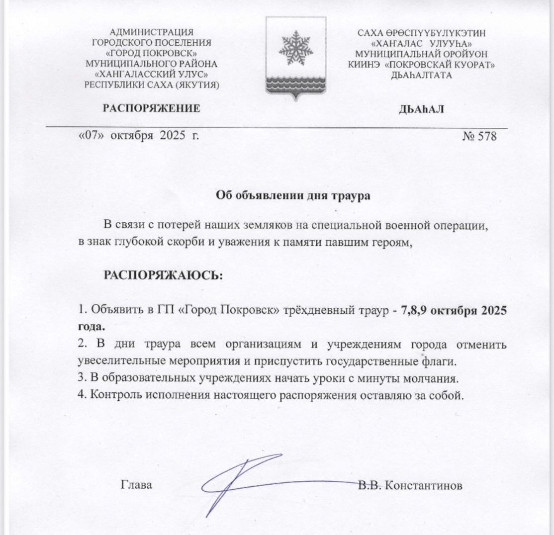 В Покровске объявлен трехдневный траур – 7, 8, 9 октября 2025 года – в знак глубокой скорби по павшим якутянам в зоне СВО. Распоряжение об этом подписал новый глава Покровска Виктор Константинов, следует из телеграм-канала «Хангаласские».