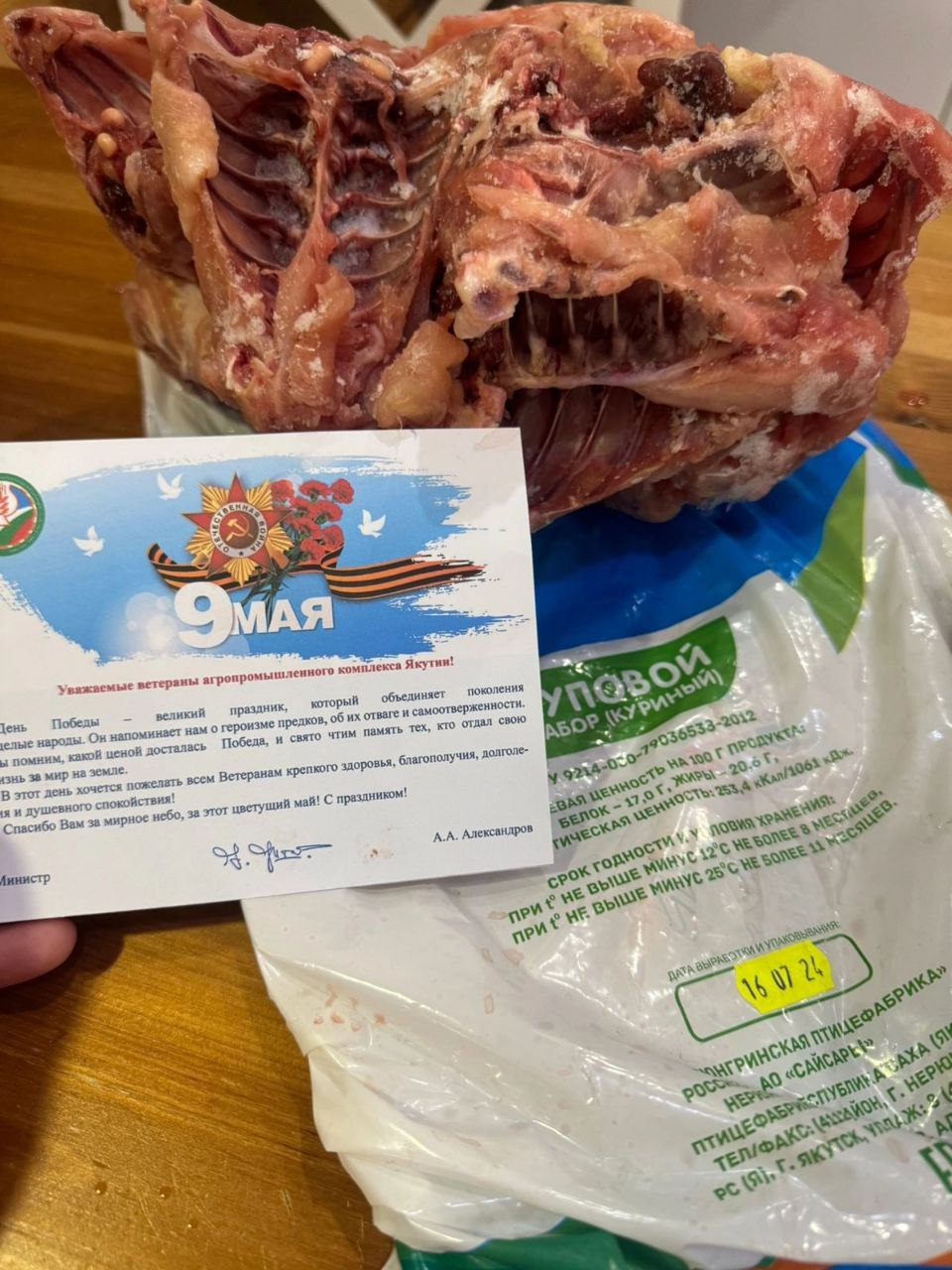Напомним, что в эти праздничные дни региональный Минсельхоз оказался в центре внимания. Ветерану ВОВ и ветерану сельского хозяйства Таисии Хромовой от Министерства сельского хозяйства Якутии ко Дню Победы были подарены: юбилейная открытка, набор из куриных костей с творожком и ряженкой. Этот подарок вызвал возмущение у внуков ветерана, посчитавших продуктовый набор оскорбительным.
