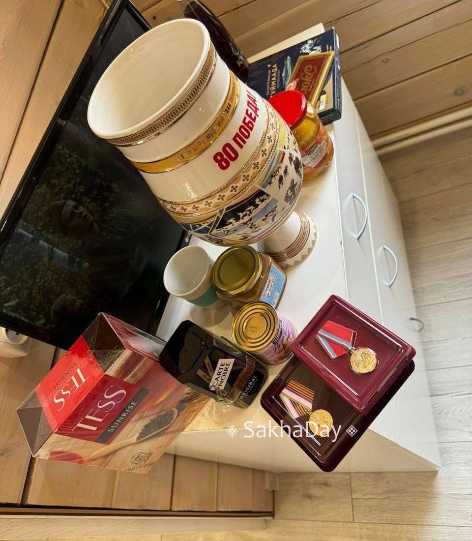 Также ветеранам дарили чороны с надписью «80 Победа!», банкукофе «Carte Noire», чай «Тэсс», конфеты «Птичье молоко», шоколад и консервы. В некоторых районах республики ветеранам дарили копченую рыбу.