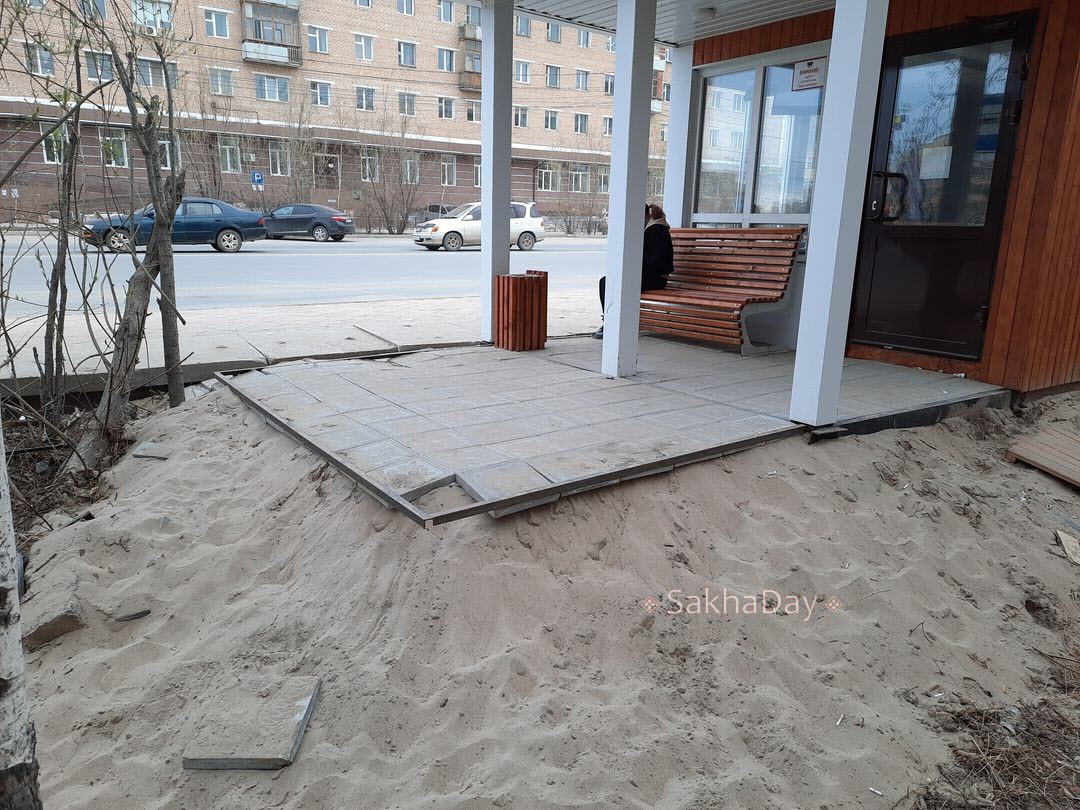 Весной этого года мэрия Якутска установила три теплые остановки. В интернете появились фотографии одной из них, на которых видно, что плитка площадки теплой остановки выложена на песочной насыпи. Местами она уже отвалилась. Фото вызвали возмущение горожан качеством проведенных работ.