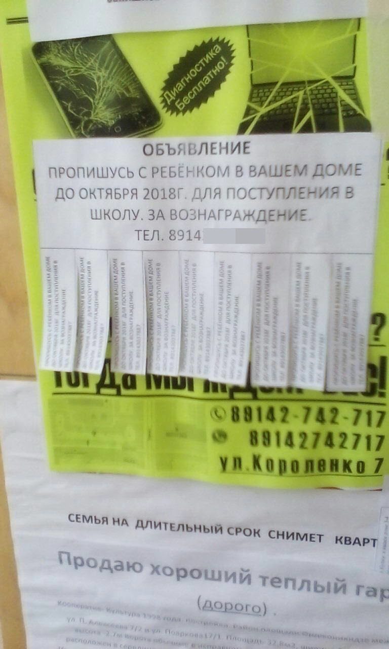 Эти объявления - проявление скрытой очень большой проблемы. Многие директора школ знают, что есть адреса, в которых прописка поставлена на поток. И никого не настораживает, когда из года в год приходят с одного адреса совершенно разные дети, не будучи родственниками.