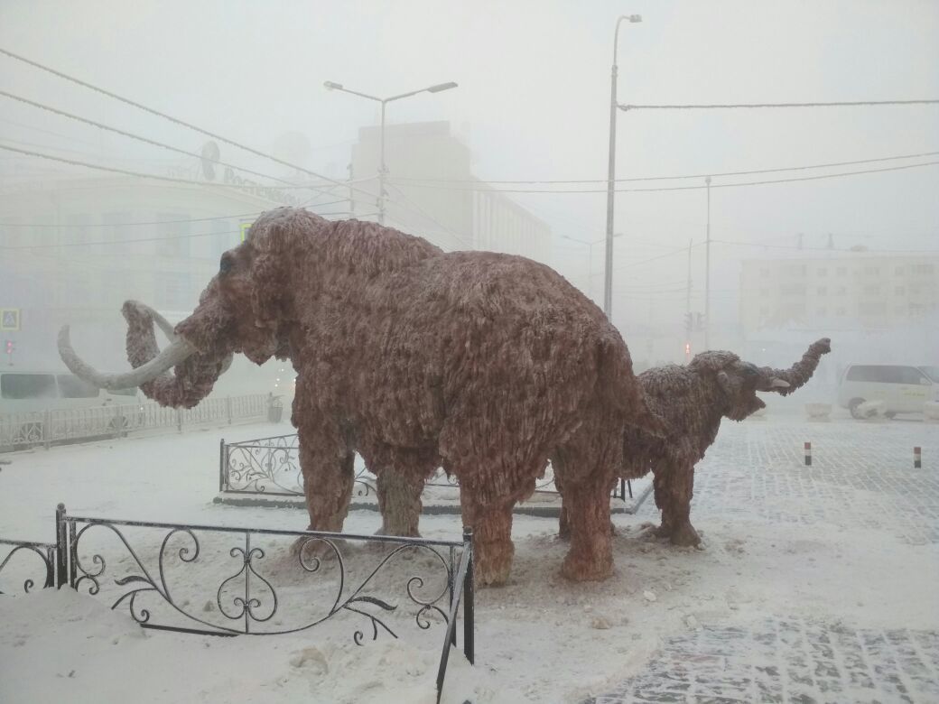 Мамонты, изготовленные по необычной технологии из мокрого снега, выросли в центре Якутска. Известный мастер Олег Саввинов с сыном Айаалом, вооружившись тазиком и перчатками, изваяли двух мамонтов за две недели.