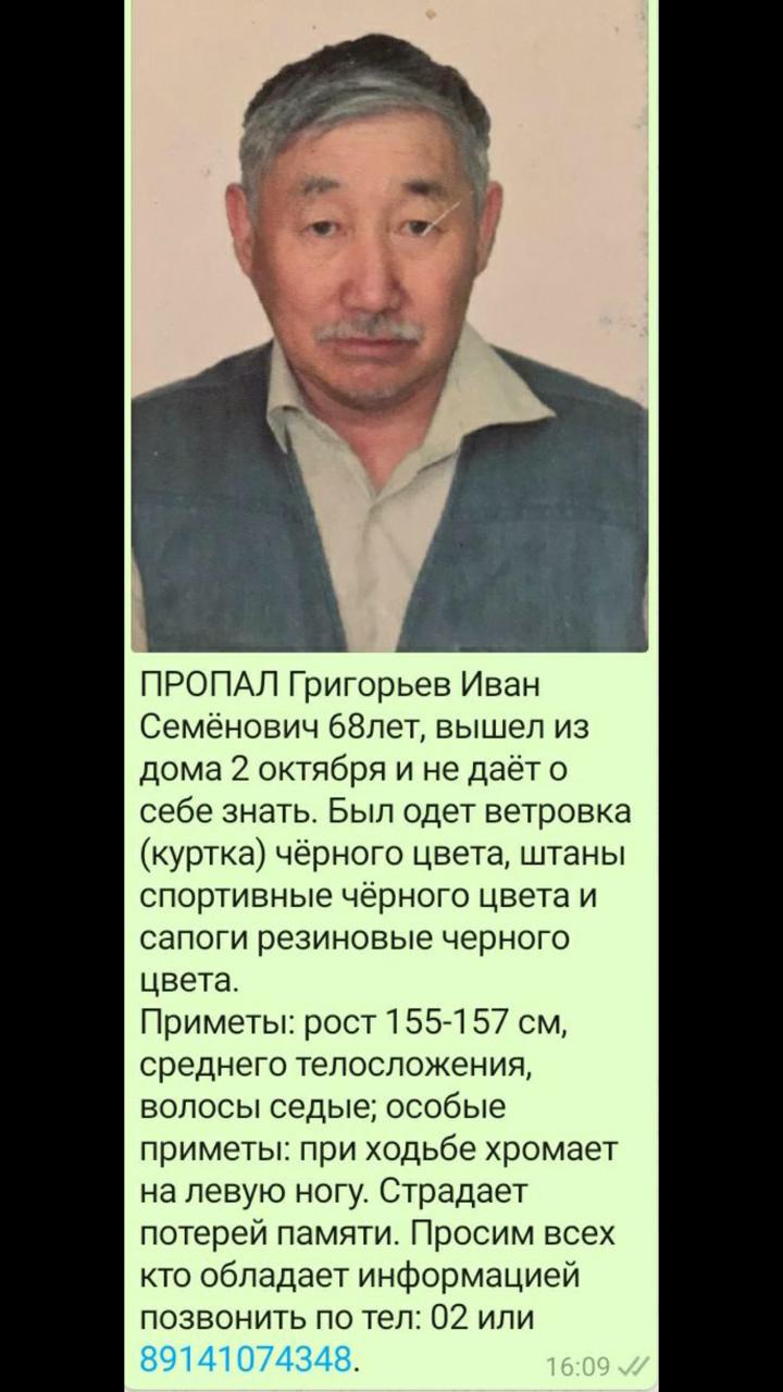 "2 октября мой отец ушел из дома в Вилюйске. 5-6 октября его видели в городе. Он вроде говорил, что собирается в лес, хотя был без соответствующей одежды. Отец был одет очень легко, ходил в ветровке и резиновых сапогах. После 6 октября он исчез. Человек он пожилой, страдает частичной потерей памяти, хромает.