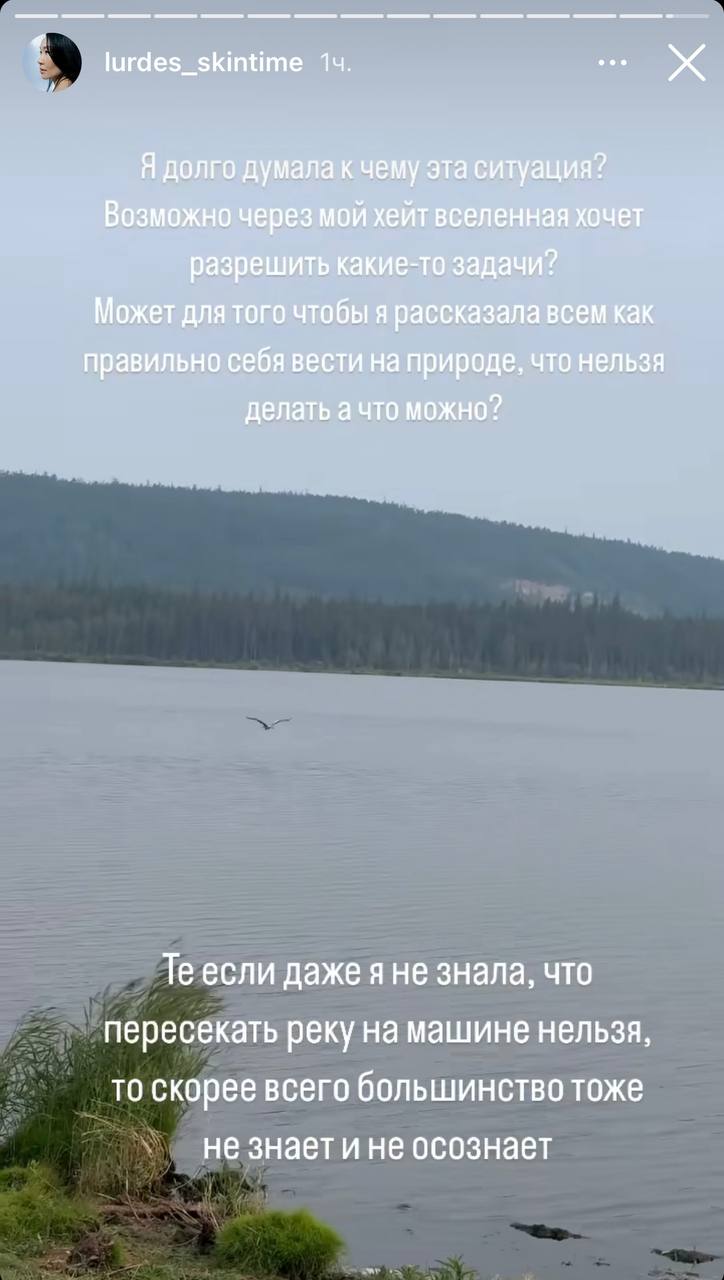 — Я долго думала, к чему эта ситуация, — написала в сторис час назад предпринимательница. — Возможно, через мой хейт вселенная хочет разрешить какие-то задачи? Может для того, чтобы я рассказала всем, как правильно себя вести на природе, что нельзя делать, а что можно?