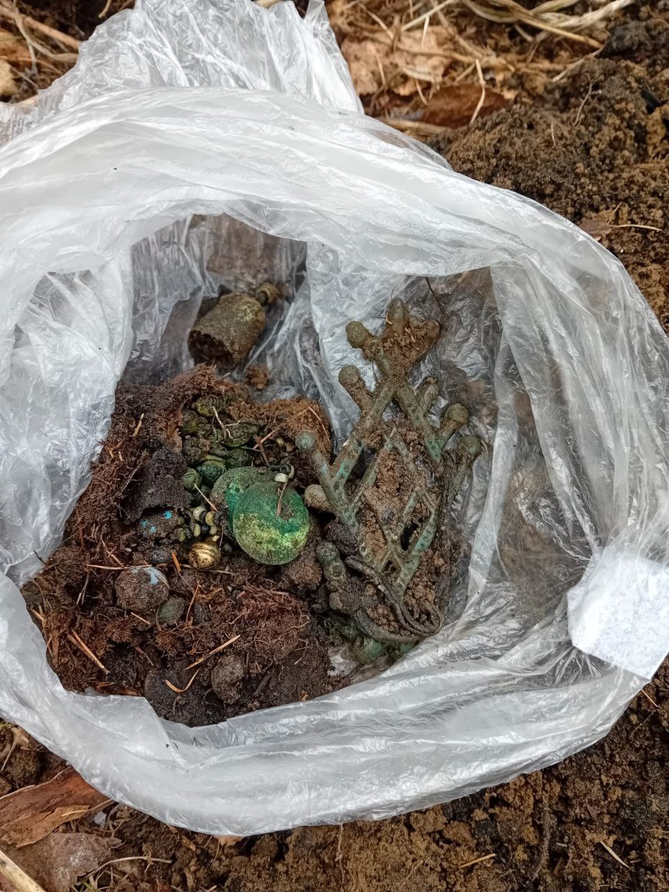 - Вчера, 31 мая, получил очень интересные фотографии. Судя по ним, это, возможно, найденный кем-то клад. Видно, что содержимое было завернуто в кожаный мешок. Это бусы, подвески, украшения пояса и другое. По всей видимости, бусы являются так называемыми пуговицами-гирьками, они использовались у нас в основном в 17-18 веках. Все это указывает на то, что это очень старинные вещи. Интересная и не совсем случайная находка.