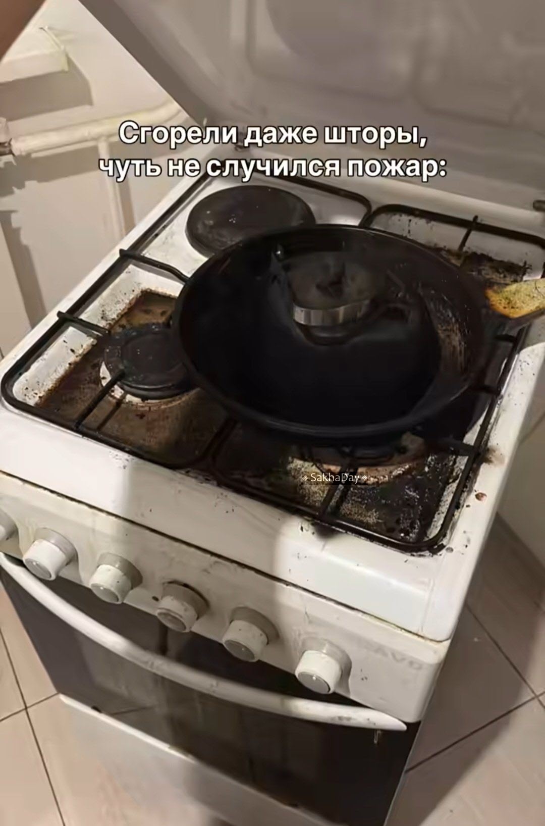 На кухне Ольга чуть не устроила пожар, об этом свидетельствуют обгоревшие шторы. Вся бытовая техника перепачкана, на раковине осталось много грязной и заплесневевшей посуды…
