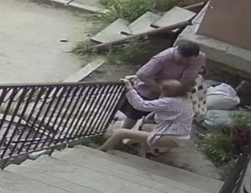 Силы бабушки заканчиваются, и в 16:13 часов она падает на крыльцо. По состоянию бабушки видно, что она переносит тяжелую болезнь, о ней плохо заботятся. На женщине только блузка и подгузники, ходит босиком.