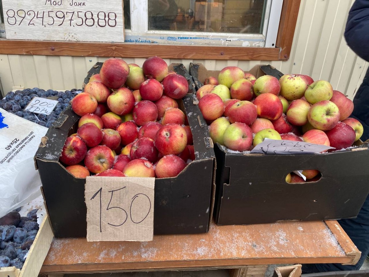 При входе на рынок идёт дегустация свежих яблок из Краснодарского края и Азербайджана за 150 рублей за килограмм. Пожалуй, на этом заканчивается список сезонных фруктов Крестьянского рынка. Цены на ягоды не изменились с лета.