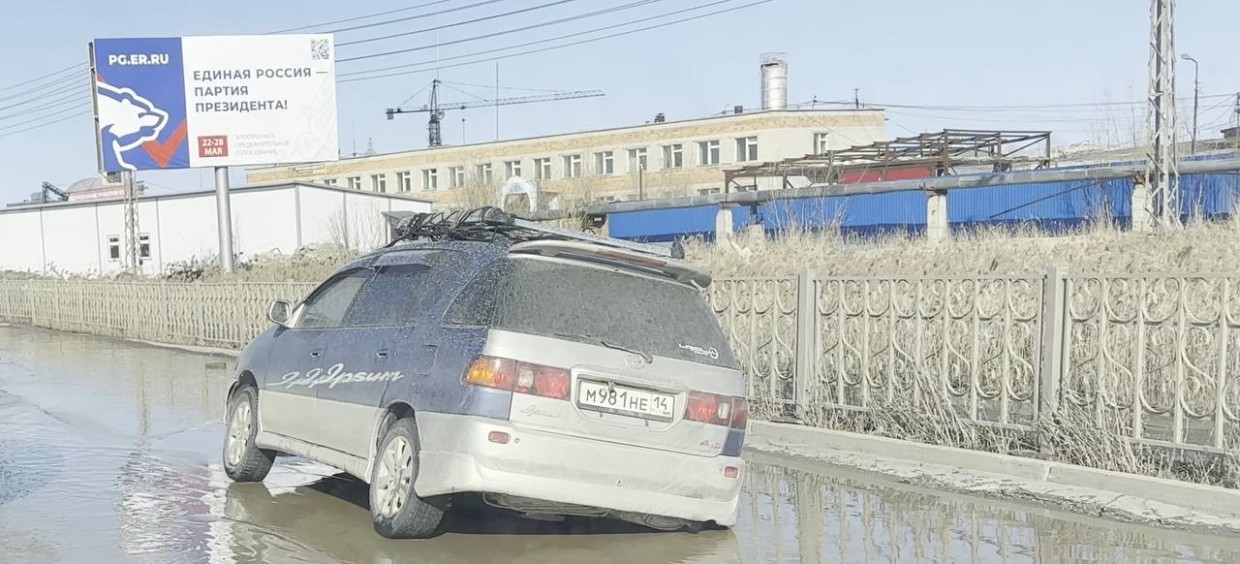 В Якутске под билбордом, на котором «Единая Россия» благодарит за голоса на праймериз, образовалась большая лужа. Вчера в нее провалился автобус. Информация об этом стала обсуждаемой в якнете. Сегодня коммунальные службы откачивают лужу.