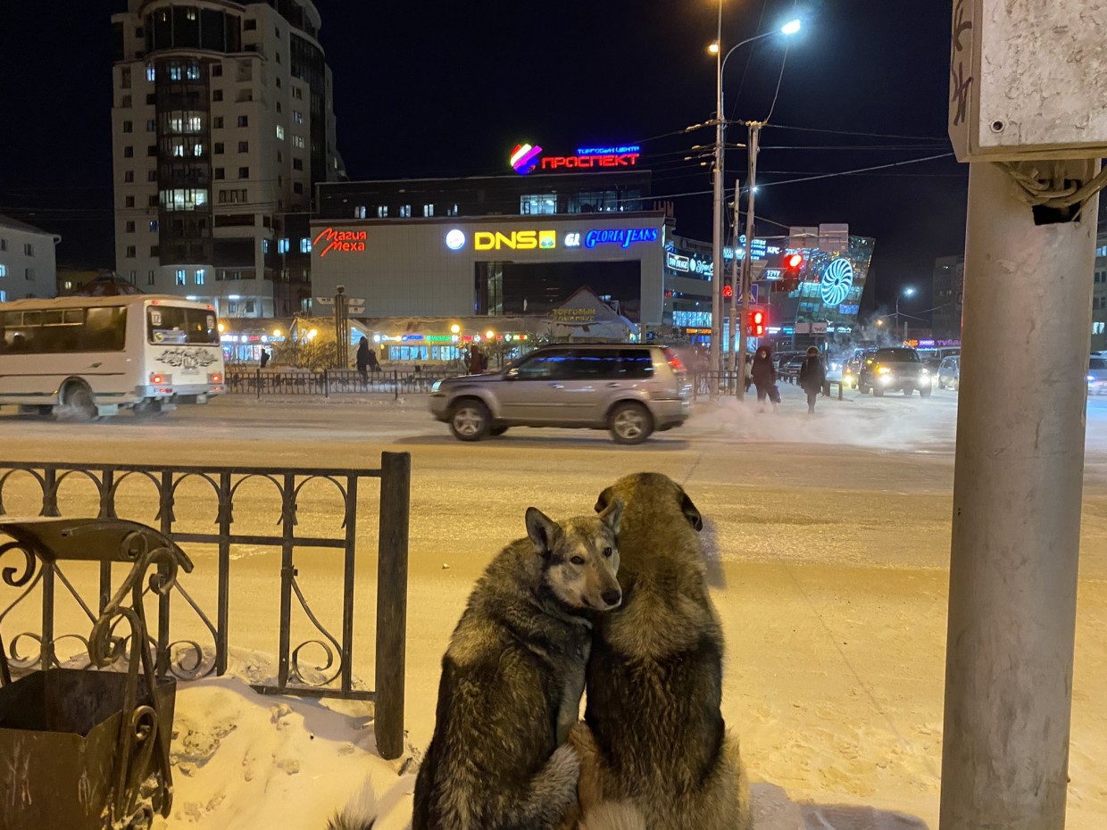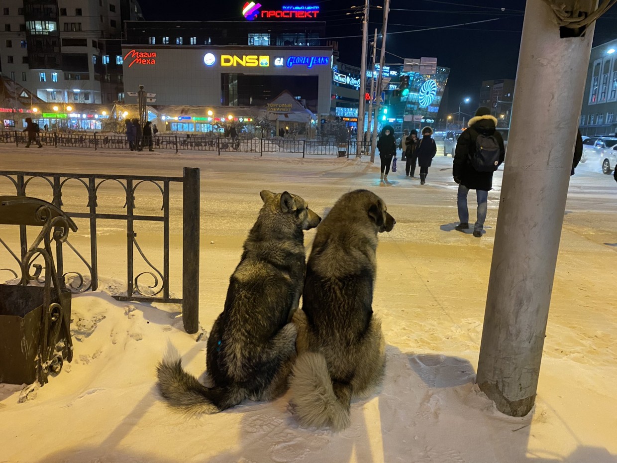 Жительница Якутска @mmalterme опубликовала в Твиттере фото влюбленной пары собак. Красивые бродячие собаки спокойно сидят у дороги и нежно смотрят друг на друга.