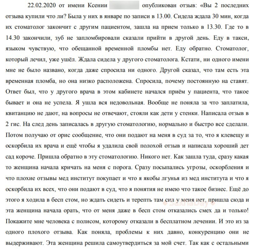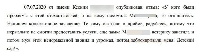 Жительница Якутска Ксения лечила зуб в «Орис+» в январе прошлого года. Оказанными услугами она осталась недовольна, о чем написала отзыв в электронном справочнике по Якутску «2ГИС». Как она написала в следующем комментарии на электронном навигаторе и пояснила суду, пациентке обратились из клиники и начали угрожать иском в суд. Записей Ксении сейчас на 2ГИС нет, предлагаем ознакомиться с ее отзывами со скриншота постановления суда.
