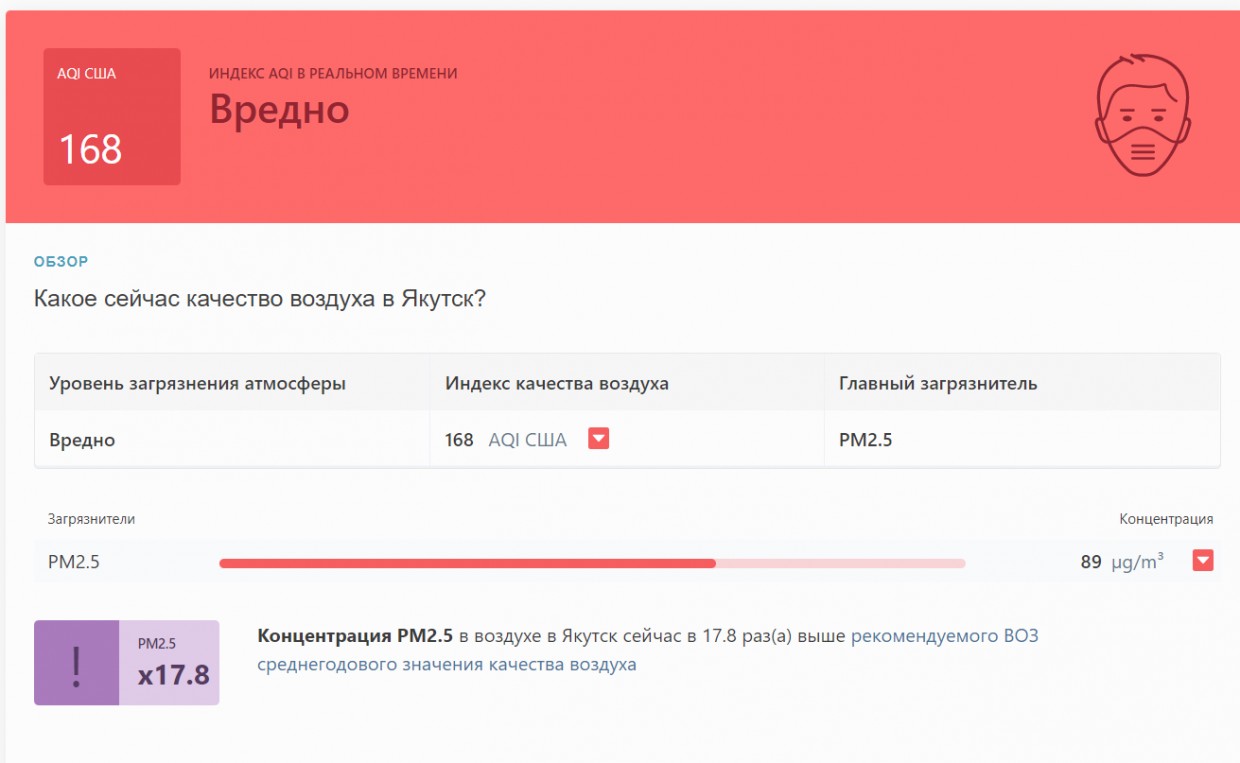 В прошлом году 2 августа концентрация частиц PM2,5 в воздухе была выше нормы в 64 раза. Тогда в Якутске стоял густой смог из-за лесных пожаров в Горном улусе.