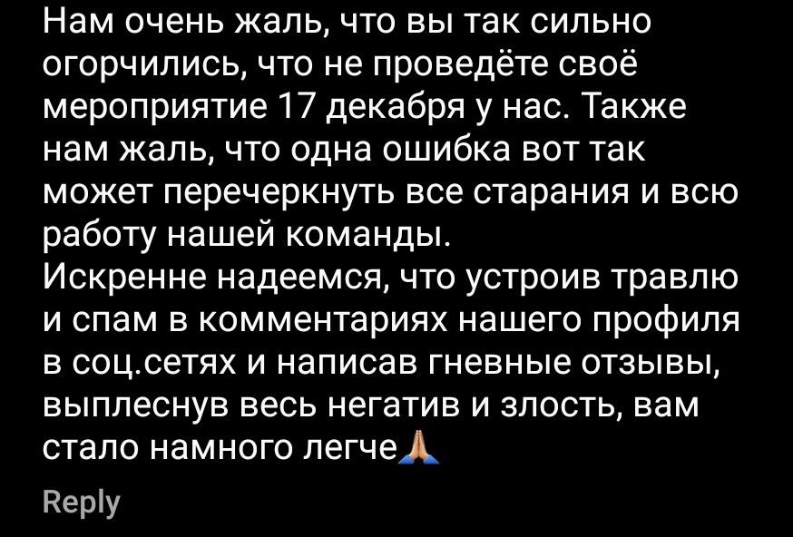 В переписке с клиенткой Shibuya извиняется и предлагает другие даты, а также переместить вечеринку во второй зал заведения. Девушка отказалась, поскольку предложенные даты ее не устроили, а в другом зале отсутствует караоке. Вот такой сервис у Shibuya, возмущается она.