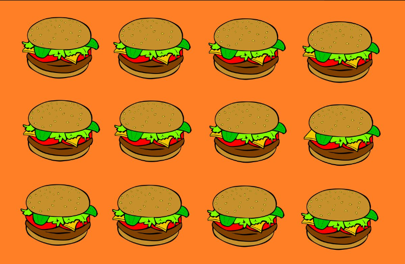 Справились с задачей? Внимательно посмотрите на второй и третий ряды. Последний бургер второго ряда и первый третьего имеют небольшие отличие в своих левых частях.