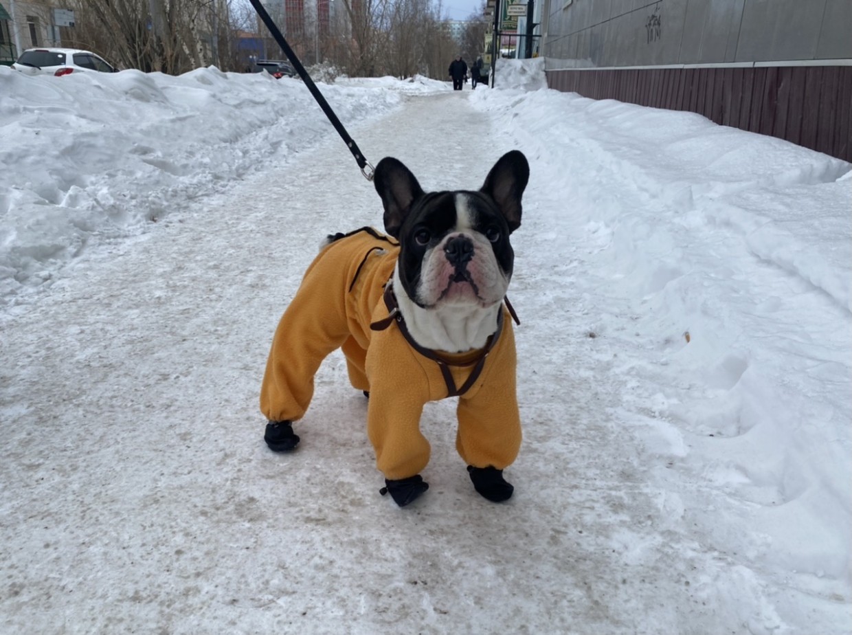 Француз возвращался домой с прогулки по площади Орджоникидзе, где потерял туфельку. И для позирования на камеру хозяин даже надел ее обратно. А оранжевый флис на французском бульдоге смотрится очень брутально.