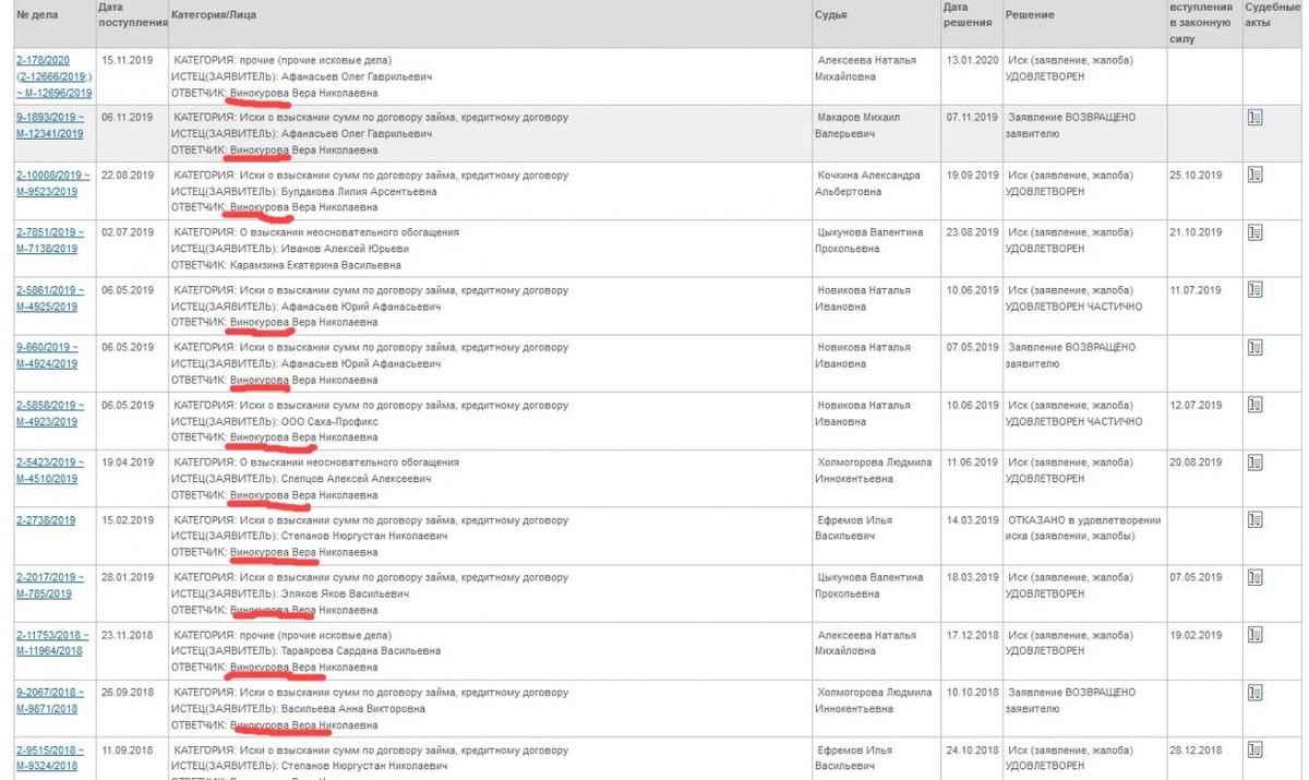 По данным Sakhaday, речь идет о Вере Винокуровой. Сама она считает, что помогала людям получать земельные участки. Женщина работала в тесной связке с Екатериной Карамзиной. Потерпевшие от их действий судились, но возврата средств добиться не могли. Судебные приставы только разводили руками, никакой недвижимости у Винокуровой не было. Удивляет то, что ряды потерпевших пополнялись с каждым годом, и это несмотря на то, что суды с ней шли с 2012 года, в основном о взыскании сумм по договору займа.