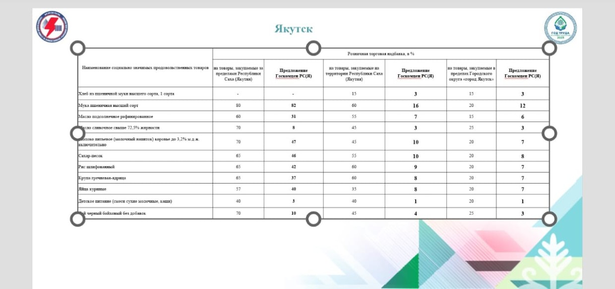 Добавим, что по просьбе предпринимателей депутат Госдумы Сардана Авксентьева написала письмо председателю правительства Якутии Кириллу Бычкову с просьбой обновить расчеты исходя из реальных объемов продаж среднестатистического магазина шаговой доступности, провести работу по изучению рынка, при этом сохранить ныне действующие предельные наценки. Подробнее читайте здесь.