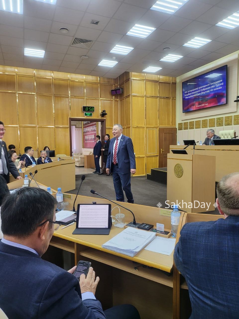 После своего эффектного появления в зале заседания Владимир Поскачин пожал руку Владимиру Федорову и обменялся с ним любезностями. Далее он прошел дальше, пожимая руки другим депутатам. (Видео, как встречали его депутаты - в тг @sakhaday)