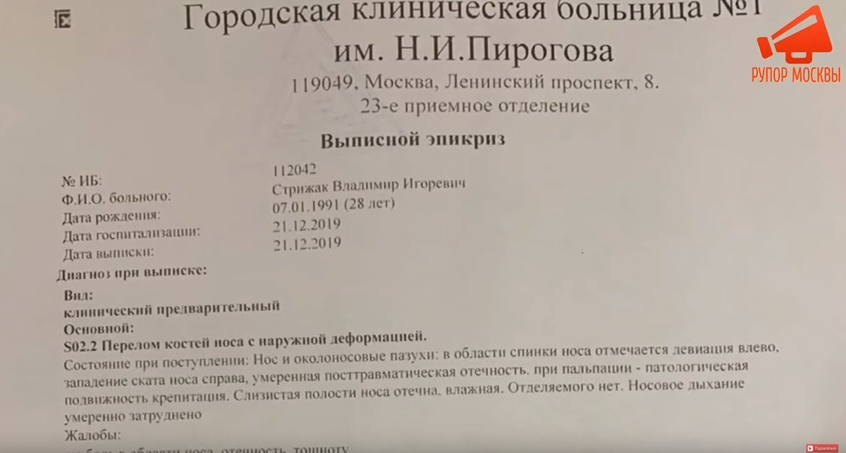 В связи с этим Владимир был направлен в Москву, где прошел обследование в Городской клинической больнице №1 им. Пирогова. В выписке указан перелом носа с наружной деформацией, что потвердило первоначальный диагноз, поставленный РБ№2.