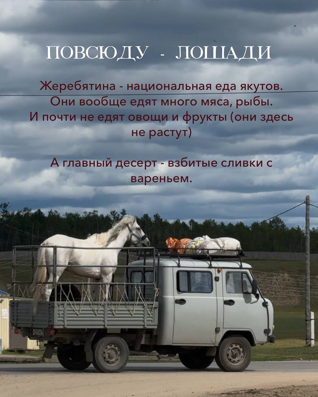 Повсюду - лошади. Жеребятина - национальная еда якутов. Они вообще едят много мяса и рыбы. И почти не едят овощи и фрукты. Они здесь не растут. А главный десерт - взбитые сливки с вареньем.