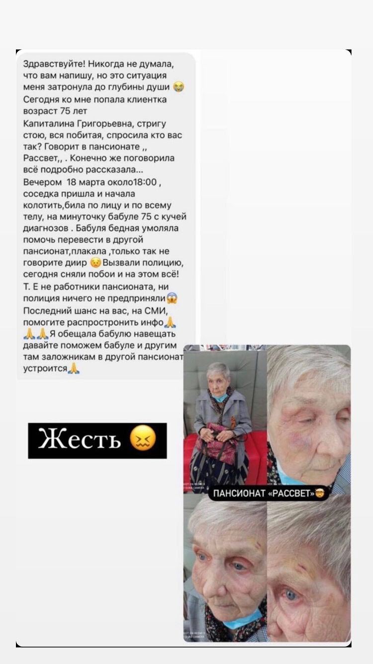 "Капиталина Григорьевна рассказала, что 18 марта соседка начала бить и колотить по лицу и всем телу. Бабуля бедная плакала, умоляла помочь перевести в другой пансионат. Вызвали полицию, сняли побои и на этом все. Работники пансионата и полиции ничего не предприняли!", - сообщила блогер.